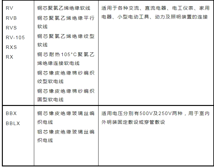 注:B(B)——第一個字母表示布線,第二個字母表示玻璃絲編制。V(V)——第一個字母表示聚乙烯(塑料)絕緣,第二個字母表示聚乙烯護(hù)套。L(L)——鋁,無L則表示銅F(F)——復(fù)合型R——軟線S——雙絞X——絕緣橡膠